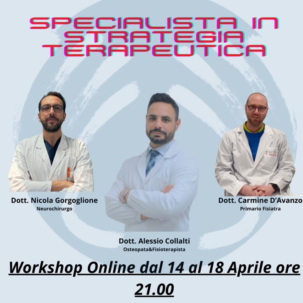 Dal 14 al 18 Aprile un Osteopata&Fisioterapista, un Medico Fisiatra ed un Neurochirurgo ti mostreranno come mettere in pratica le stesse procedure che usano nella loro pratica professionale e nei lori studi per pianificare una CORRETTA STRATEGIA TERAPEUTICA e portare a guarigione un paziente che si presenta all’interno del tuo studio.